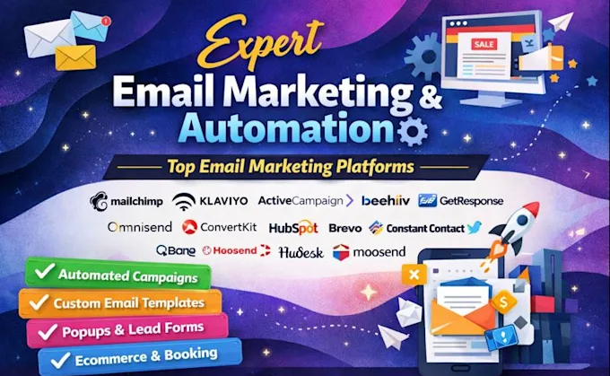 Mailchimp, Klaviyo, GetResponse, ActiveCampaign, Omnisend, Beehiiv, ConvertKit, MailerLite, HubSpot, Brevo (Sendinblue), Constant Contact, AWeber, Campaign Monitor, Drip, Moosend, Flodesk, Keap (Infusionsoft), Zoho Campaigns, Salesforce Marketing Cloud, Benchmark Email, Elastic Email, SendPulse, EmailOctopus, Squarespace Email Campaigns, Wix Email Marketing.